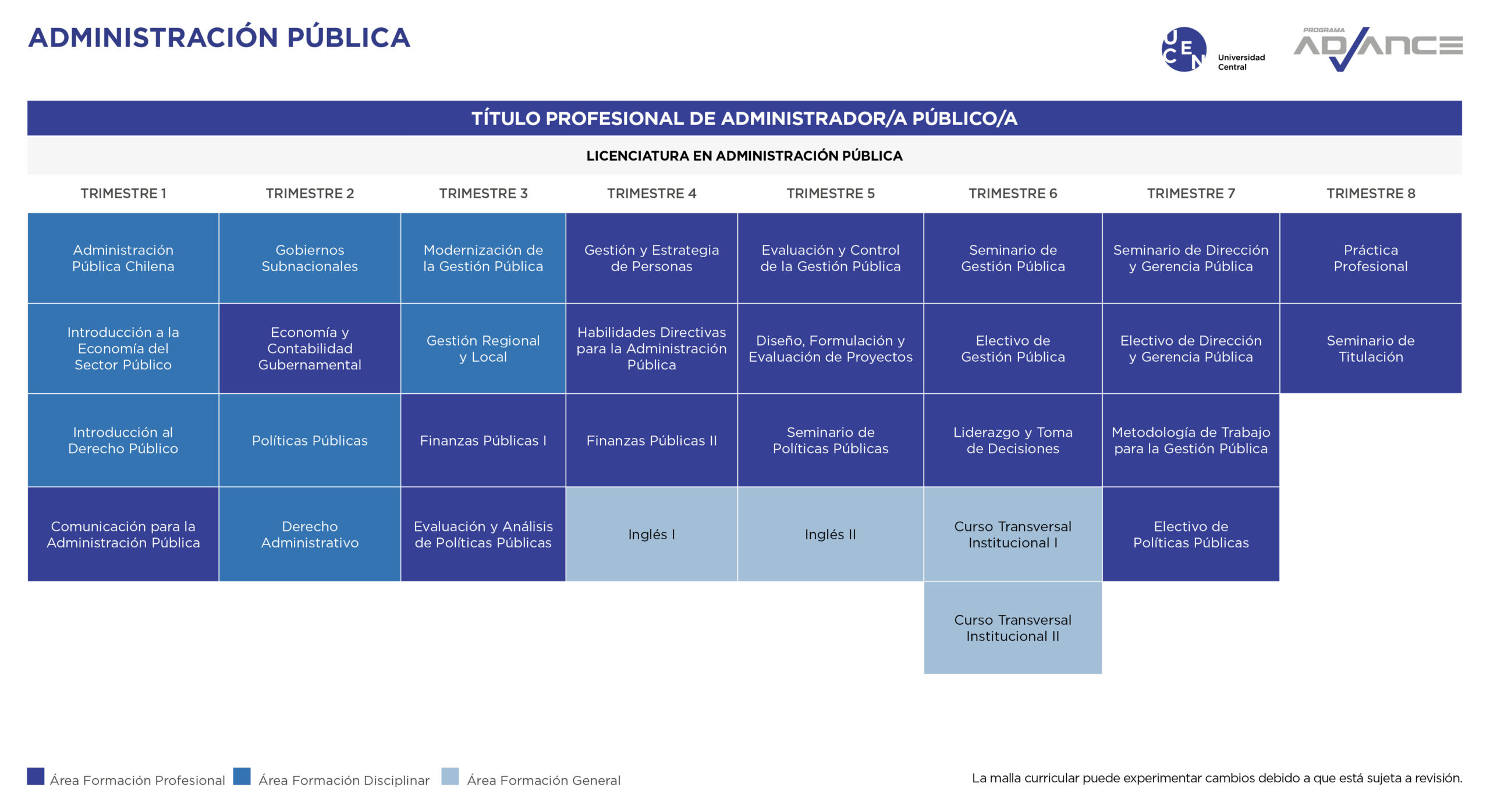 El Programa Advance en Administración Pública de la U. Central te transforma en un profesional comprometido, que sirve al país desde una perspectiva crítica, ética y de excelencia, destacándose por un conocimiento íntegro de la gestión y de las políticas públicas, así como por su capacidad para formar parte de equipos directivos de instituciones públicas a nivel nacional y subnacional. Sabe desempeñarse como gestor/a de procesos administrativos en contextos dinámicos y complejos, con dominio de las políticas públicas y como asesor/a eficiente y eficaz en la toma de decisiones al interior de las organizaciones públicas.