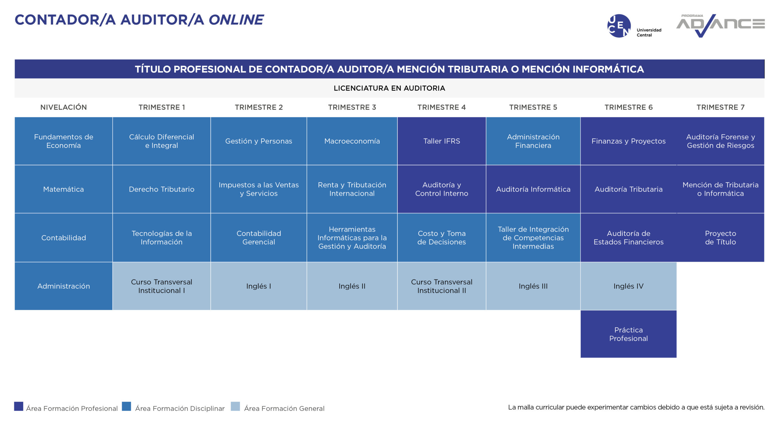 El Programa Advance en Contador/a Auditor/a de la U. Central te transforma en un/a profesional que gestiona los distintos sistemas contables y evalúa los procesos de control y gestión de riesgos, contribuyendo con pensamiento crítico e independiente a la eficiencia en la gestión de la organización.