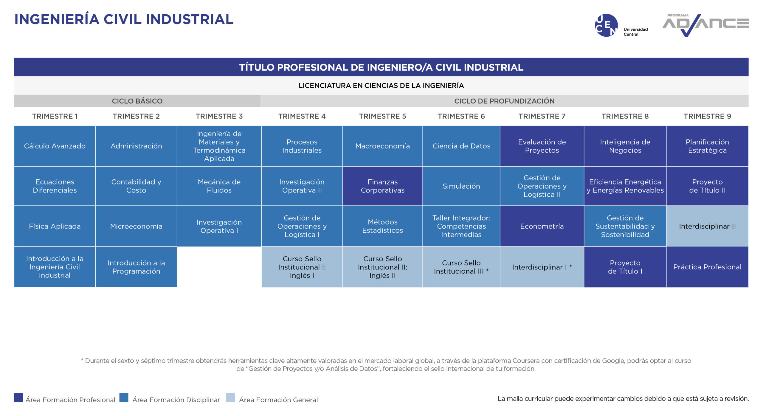 El Programa Advance Ingeniería Civil Industrial de la U. Central te transforma en un/a profesional capaz de asumir un rol activo en diversas organizaciones o iniciativas propias de negocio, contribuyendo como un/a agente de cambio en la gestión organizacional y gestión de producción y operaciones a través de la innovación e integración tecnológica, para el desarrollo sostenible de las mismas, dentro de un contexto de globalización y competitividad.