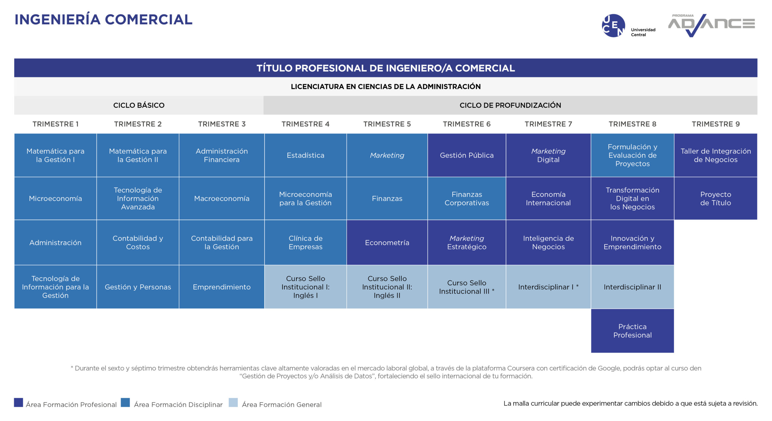 El Programa Advance en Ingeniería Comercial de la U. Central te transforma en un/a profesional con visión global, pensamiento crítico y comunicación efectiva, capaz de liderar equipos de trabajo multidisciplinarios y tomar decisiones estratégicas con el objetivo de optimizar la gestión y crear valor en las empresas.