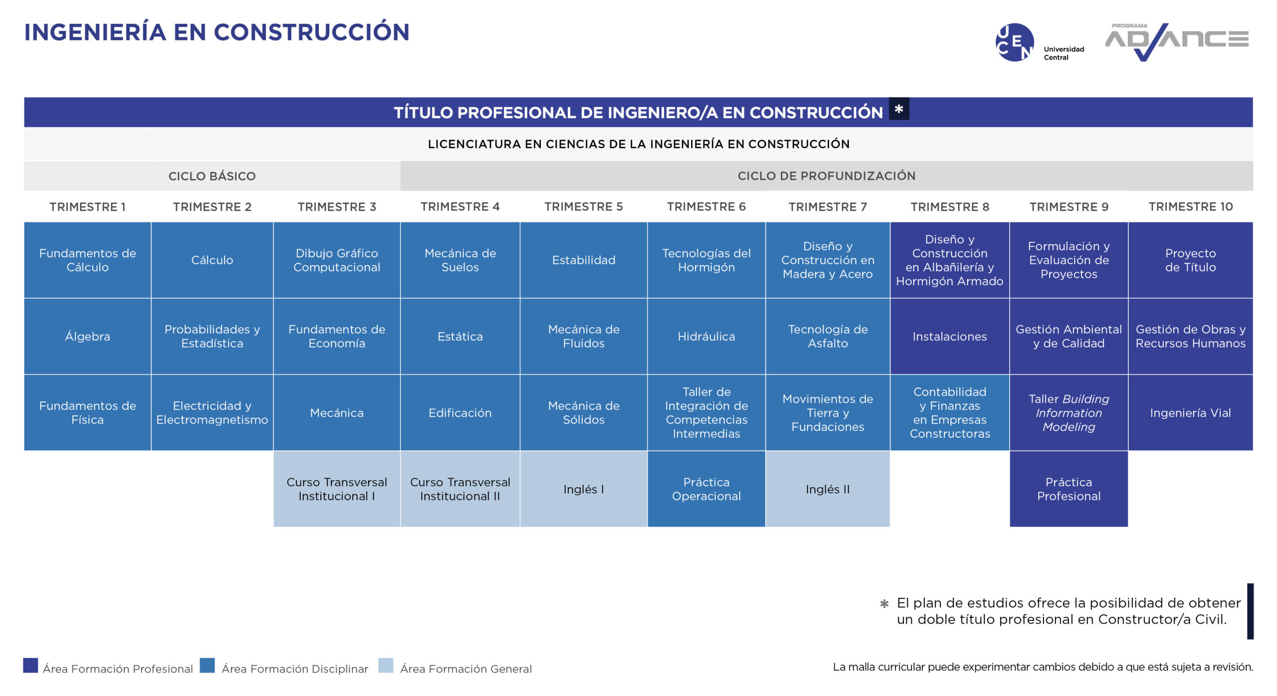 El Programa Advance en Ingeniería en Construcción de la U. Central te transforma en un profesional con capacidad de liderazgo y trabajo en equipo, altamente competente en ámbitos vinculados a las tecnologías de la información, tecnologías constructivas, diseño y gestión de la construcción, lo que te permitirá un desarrollo eficiente en el mundo laboral.