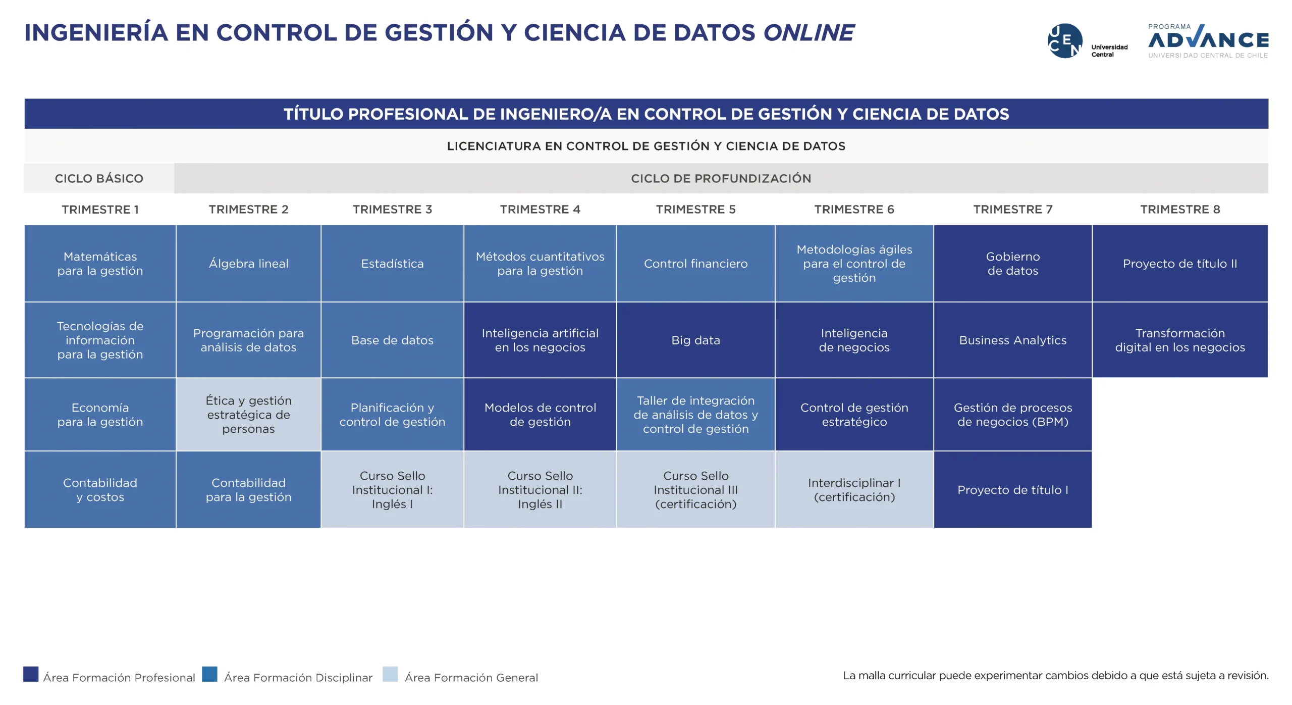 El Programa Advance en Ingeniería en Control de Gestión y Ciencia de Datos de la U. Central te forma como un/a profesional capaz de asumir un rol activo en organizaciones públicas y privadas, contribuyendo en la toma de decisiones estratégicas basadas en información. Podrás desempeñarte como un/a agente de cambio en la gestión organizacional, diseñando, implementando y gestionando sistemas de control apoyados en el análisis de datos, integrando herramientas de ciencia de datos y tecnologías digitales para mejorar el desempeño, optimizar procesos y generar valor en entornos dinámicos y altamente competitivos.