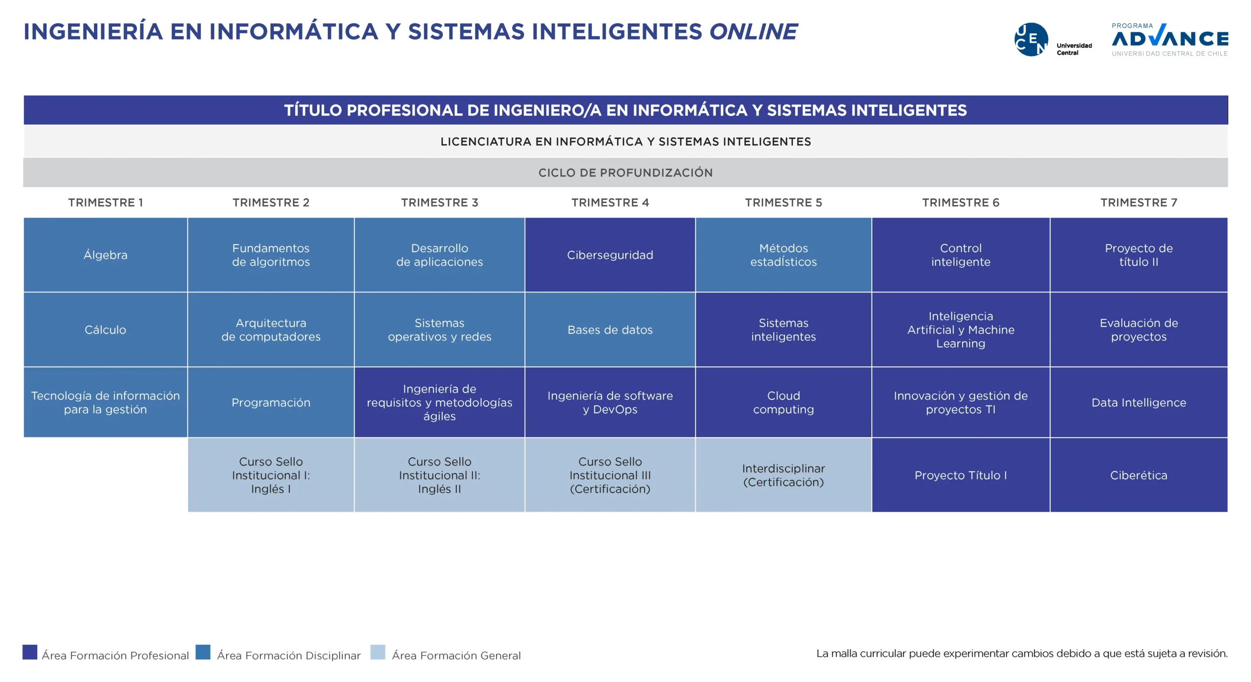 El Programa Advance en Ingeniería en Informática y Sistemas Inteligentes de la U. Central te forma como un/a profesional capaz de asumir un rol activo en distintos contextos organizacionales, tanto en el desarrollo de soluciones tecnológicas como en iniciativas propias. Podrás desempeñarte como un/a agente de cambio en la transformación digital, diseñando, implementando y gestionando sistemas informáticos y soluciones basadas en inteligencia artificial, análisis de datos y automatización, contribuyendo a la eficiencia operativa, la innovación y la mejora continua en entornos dinámicos y altamente competitivos.