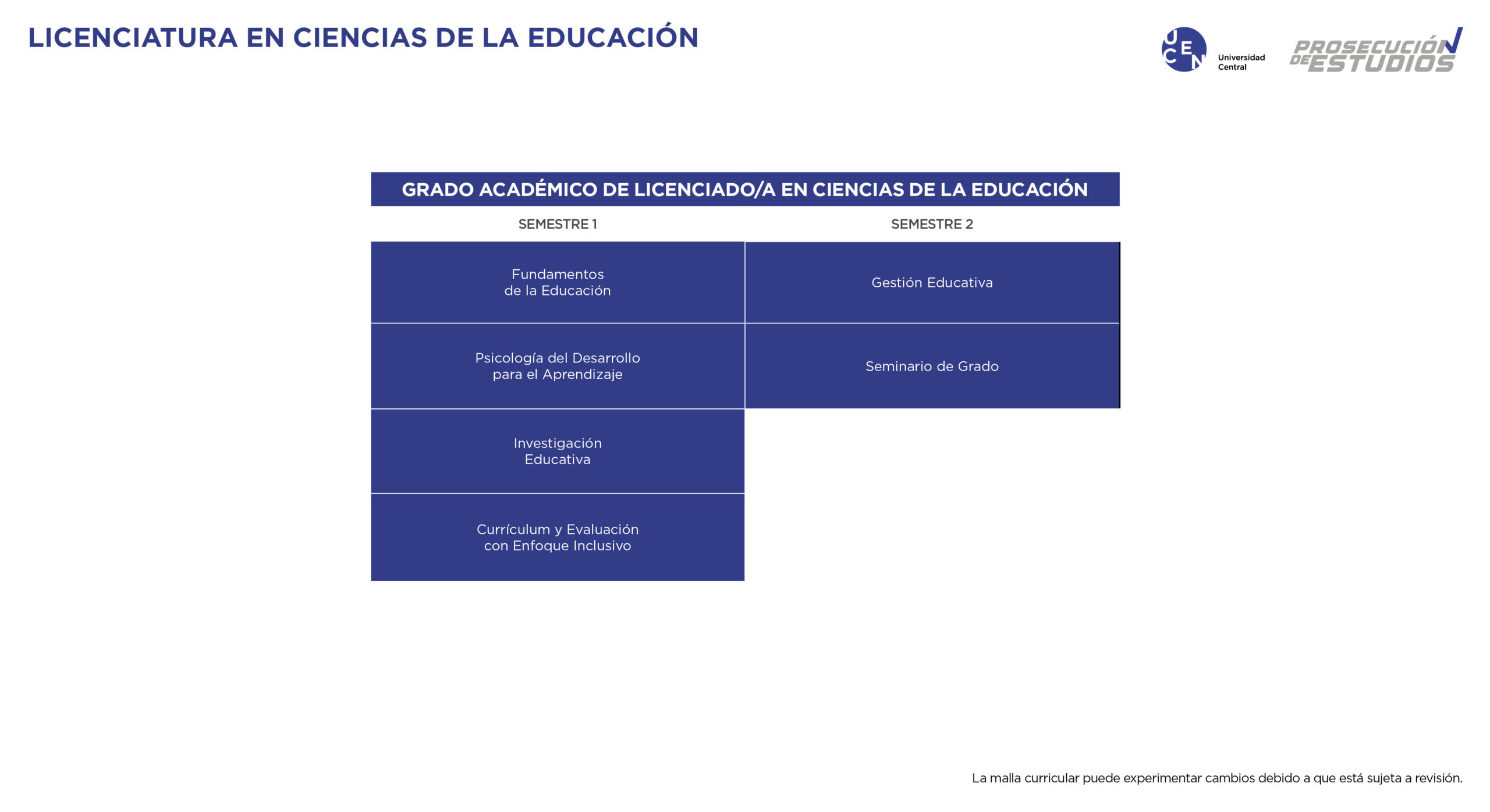 El/la egresado/a del programa de Licenciatura en Ciencias de la Educación de la U. Central posee las competencias que lo/la habilitan para analizar y fundamentar su desempeño profesional desde una perspectiva interdisciplinaria, siendo capaz de generar propuestas educativas a partir de la interpretación de situaciones y hechos del contexto educativo; reflexionando sobre sus consecuencias y efectos por medio de los fundamentos de la educación, el pensamiento crítico y la investigación educativa.