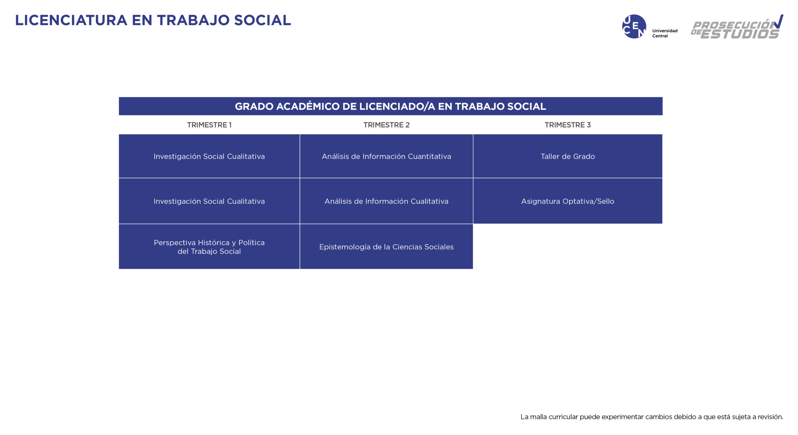 Los/as licenciados/as en Trabajo Social de la U. Central poseen competencias para desempeñarse en el ámbito de la investigación social con una perspectiva ética, reflexiva y crítica. En su ejercicio como licenciados/as asumen un enfoque de derechos y respeto a la dignidad de las personas, comunicando de manera clara, adecuada y pertinente información relevante, según propósitos, audiencias y contextos.